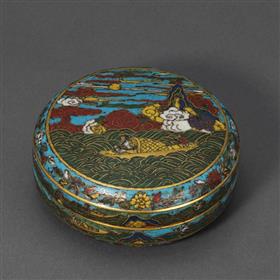 Dating of this group of boxes is not straightforward. Most published dates tend, as here, to place the boxes around 1500 AD, with some margin in each direction, and that has been followed here. However, several features point to the actual date of manufacture being at the early end of this range, or perhaps even earlier. The first is the wirework, which employs, in the case of the present box, at least three different thicknesses of wire and, even more unusually, the use of solid areas of bronze for the boats. This latter technique, sometimes called (though not quite accurately) “champlevé,” is also used for some reign marks on Xuande cloisonné pieces, notably the famous very large dragon-decorated jar and cover in the British Museum (Registration number 1957,0501.1). This jar, interestingly, exhibits a closely comparable palette of enamel colours: dark blue, turquoise, yellow, black, white, dark green and, most notably, light purple. The unusual palette of the jar, which additionally includes small areas of mixed red and white, was enough to make Sir Harry Garner, the pioneer of cloisonné dating in the west, place it in the latter part of the fifteenth century despite the reign mark. The jar is now accepted as a product of the Xuande court; perhaps this group of unusual boxes may one day be similarly redated.